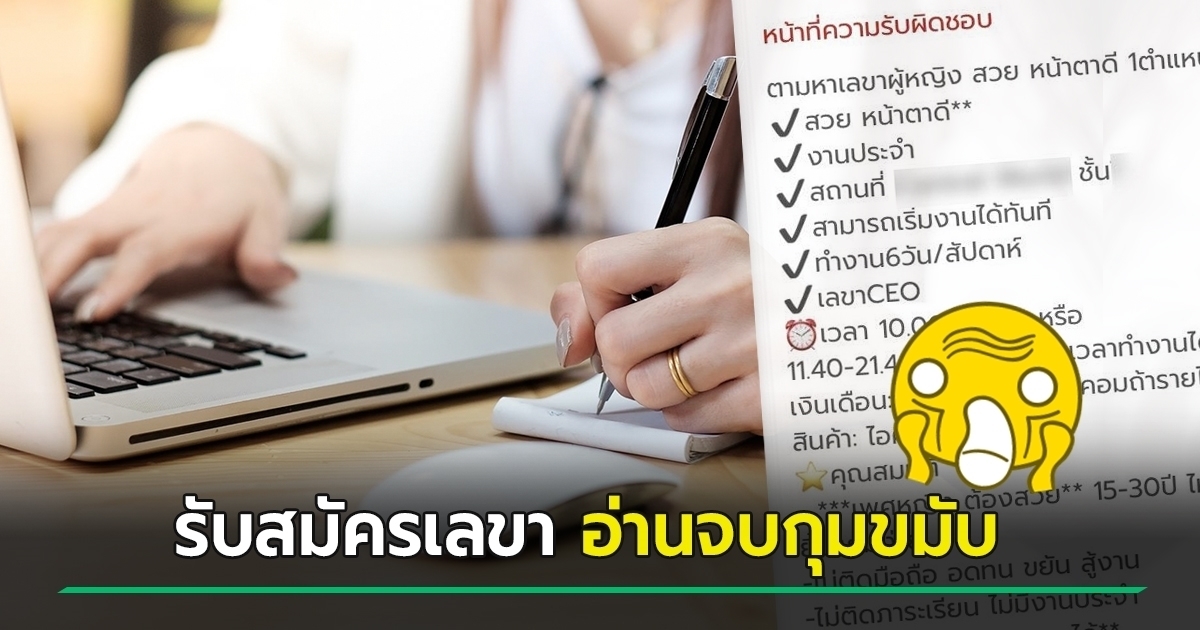 แชร์ภาพรับสมัครงานตำแหน่งเลขา เน้นต้องสวย สู้งาน รับผิดชอบหน้าร้าน ร่วมงานกับ CEO ทำวันละ 10 ชม. สัปดาห์ละ 6 วัน ให้เงินเดือนเท่านี้ ทำโซเชียลคอมเมนต์เพียบ