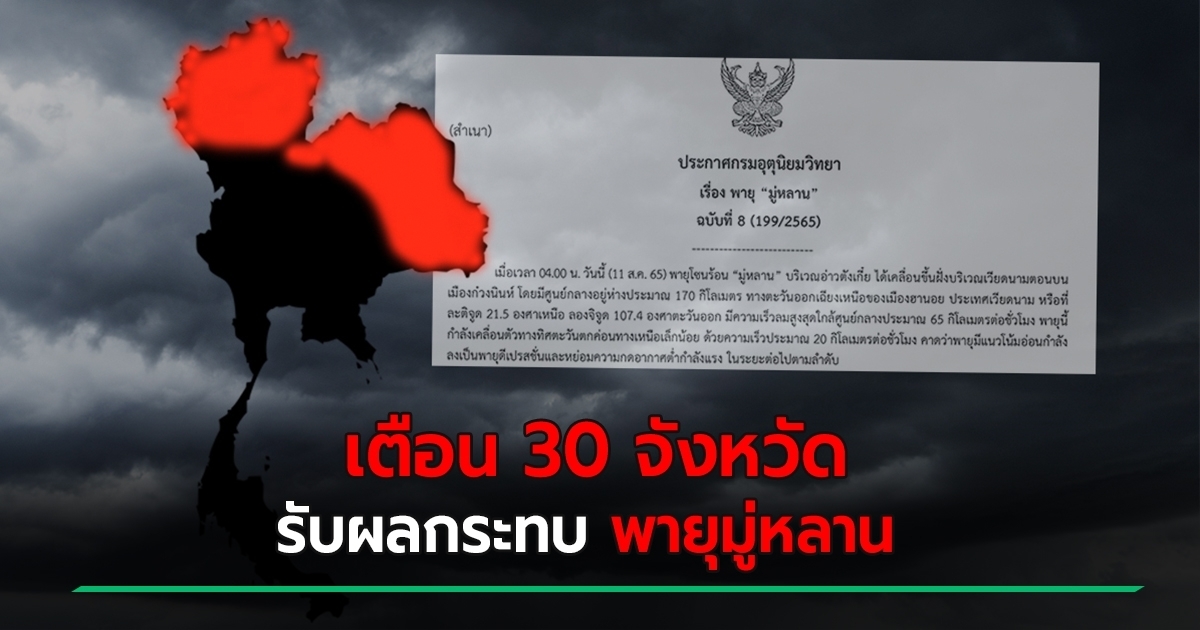 อุตุฯ ประกาศเตือน ฉบับ 8 พายุมู่หลาน ขึ้นฝั่งเวียดนามแล้ว มีแนวโน้มอ่อนกำลังลง กระทบไทย 30 จังหวัด 11-13 ส.ค. ฝนตกหนักมาก เสี่ยงน้ำท่วมฉับพลัน น้ำป่าหลาก