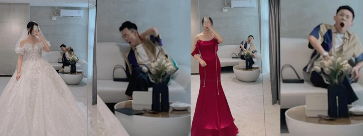 เฟซบุ๊กเพจ CoNsの少男時代經典愛情語錄 ได้เผยภาพของคู่รักคู่หนึ่ง ไปลองชุดแต่งงาน ระหว่างที่นั่งรอคุณแฟนลองชุดจนเพลิน ยังหาชุดที่ถูกใจไม่ได้ พี่แกหาวหนักมาก ลองไปกี่ชุดก็หาวไม่หยุด ดูท่าแล้วคงจะง่วงนอนแน่ ๆ ชาวเน็ตพากันขำทั้งโซเชียล