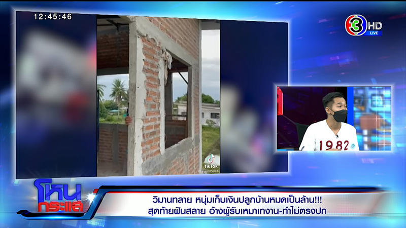 จากกรณีคลิปไวรัลใน TikTok ครอบครัวหนึ่งเก็บหอมรอมริบเงินไปสร้างบ้านหลังหนึ่ง แต่สิ่งที่ได้กลับไม่ตรงปก แค่ขย่มกำแพงเหมือนจะถล่มลงมา มีคนแชร์ต่อเป็นจำนวนมาก ยอดวิวพุ่งถึง 3 ล้าน รายการโหนกระแส วันที่ 17 สิงหาคม 2565 สัมภาษณ์ สุวรรณ คุณพ่อเจ้าของบ้าน มาพร้อม ทัด ลูกชาย และ ทนายเจมส์ นิติธร แก้วโต
