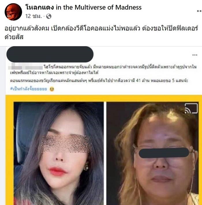 ทั้งนี้ ทางเพจระบุว่า "อยู่ยากแล้วสังคม เปิดกล้องวีดีโอคอลไม่พอแล้ว ต้องขอให้ปิดฟิลเตอร์ด้วย"