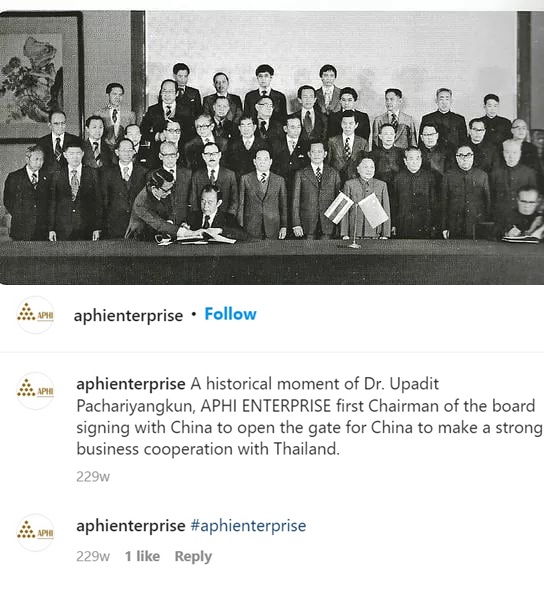 อย่างไรก็ตาม ยังมีอีกข้อมูลหนึ่งที่น่าสนใจเกี่ยวกับ APHI Enterprise เพราะทางบริษัทมีการลงภาพนายอุปดิศร์ ปาจรียางกูร ระบุว่าเป็นประธานคนแรกของบริษัท APHI ENTERPRISE เซ็นสัญญาทำธุรกิจร่วมกับประเทศจีน เพื่อเปิดทางในการสร้างความร่วมมือทางการค้าระหว่างไทย-จีน โดยที่ในภาพมีนายเติ้ง เสี่ยวผิง อดีตประธานาธิบดีของจีนอยู่ในรูปด้วย โดยคาดว่าในภาพนี้ นายอุปดิศร์ ได้เดินทางไปเซ็นสัญญาสานความสัมพันธ์กับจีน ในฐานะรัฐมนตรีว่าการกระทรวงการต่างประเทศ