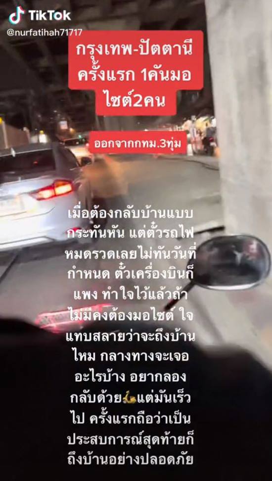 โดยผู้ใช้ TikTok @nurfatihah71717 ระบุว่า ทริปนี้เป็นช่วงปลายเดือนเมษายนที่ผ่านมา ใครกลับช่วงนั้นจะรู้ดีว่าช่วงนั้นตั๋วรถไฟเต็มเร็วมาก เพราะเป็นช่วงวันหยุดยาว อีกทั้งตรงกับเทศกาลฮารีรายอ ของชาวมุสลิมด้วย ส่วนตั๋วเครื่องบินราคาก็พุ่งเกือบ 3 พันบาทต่อคน ทั้งคู่เลยเดินทางด้วยรถมอเตอร์ไซค์ จาก กทม. ไปที่ปัตตานี ชนิดที่ว่าต่อให้ไม่พร้อมก็ต้องพร้อม
