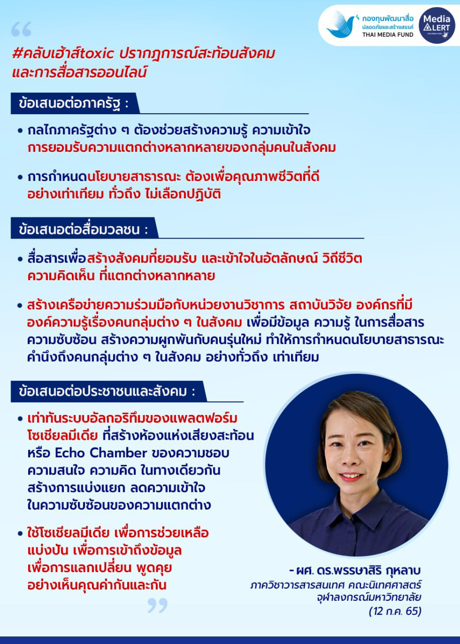 เมื่อการสื่อสารของกลุ่มคลับเฮ้าส์ Toxic เหยียดคนอีสานถูกเผยแพร่ แล้วผู้ใช้สื่อออนไลน์ออกมาตอบโต้นั้น ผู้ช่วยศาสตราจารย์ ดร.พรรษาสิริ ให้ความเห็นว่า การสื่อสารควรเป็นไปอย่างสร้างสรรค์ เพราะการใช้ถ้อยคำหรือข้อความที่แฝงด้วยการประชดประชัน หรือด่าทอกันแรง ๆ เพียงอย่างเดียว ไม่อาจทำให้สังคมเกิดการเปลี่ยนแปลง ดังนั้นควรกลับมาทบทวนว่าการแลกเปลี่ยนบทสนทนาที่เกิดขึ้นนั้นมีจุดประสงค์เพื่ออะไร มากกว่าการใช้พื้นที่ออนไลน์เป็นเพียงสนามปะทะทางอารมณ์ โดยการพูดคุยแลกเปลี่ยนความคิดเห็นอย่างสร้างสรรค์ เพื่อนำไปสู่การเปลี่ยนแปลงและยกระดับคุณภาพสังคมต่อไป ทั้งที่ปัจจุบันสื่อโซเชียลมีเดียหรือสังคมออนไลน์เป็นที่นิยม และเป็นสื่อกลางให้คนจากหลากหลายกลุ่มได้พูดคุยแลกเปลี่ยนความคิดเห็น ส่งผลให้เกิดความเข้าใจ ความช่วยเหลือ และความร่วมมือซึ่งกันและกัน ดังเช่นเมื่อเกิดภัยพิบัติ หรือการระบาดของโควิด-19 ทำให้เกิดปัญหาต่าง ๆ ตามมา จนรัฐไม่สามารถแก้ไขได้ทันท่วงที สื่อออนไลน์ทำหน้าที่เป็นตัวกลาง ทำให้คนที่อยู่ต่างพื้นที่ได้รับรู้สถานการณ์ ประสานความช่วยเหลือต่าง ๆ ซึ่งไม่จำกัดแค่ในประเทศเท่านั้น ดังจะสังเกตได้จากเมื่อเกิดภัยพิบัติในประเทศอื่น ๆ ก็จะเห็นการประกาศระดมทุนหรือการขอความช่วยเหลือต่าง ๆ ผ่านสื่อออนไลน์ ตลอดจนการพูดคุยแลกเปลี่ยนความคิดเห็นในประเด็นที่มีความเปราะบาง และสื่อมวลชนอาจไม่ได้นำมาพูดคุยในพื้นที่สาธารณะมากนัก สื่อสังคมออนไลน์ก็กลายเป็นอีกหนึ่งพื้นที่ให้ทุกคนเข้ามาร่วมพูดคุยกันได้