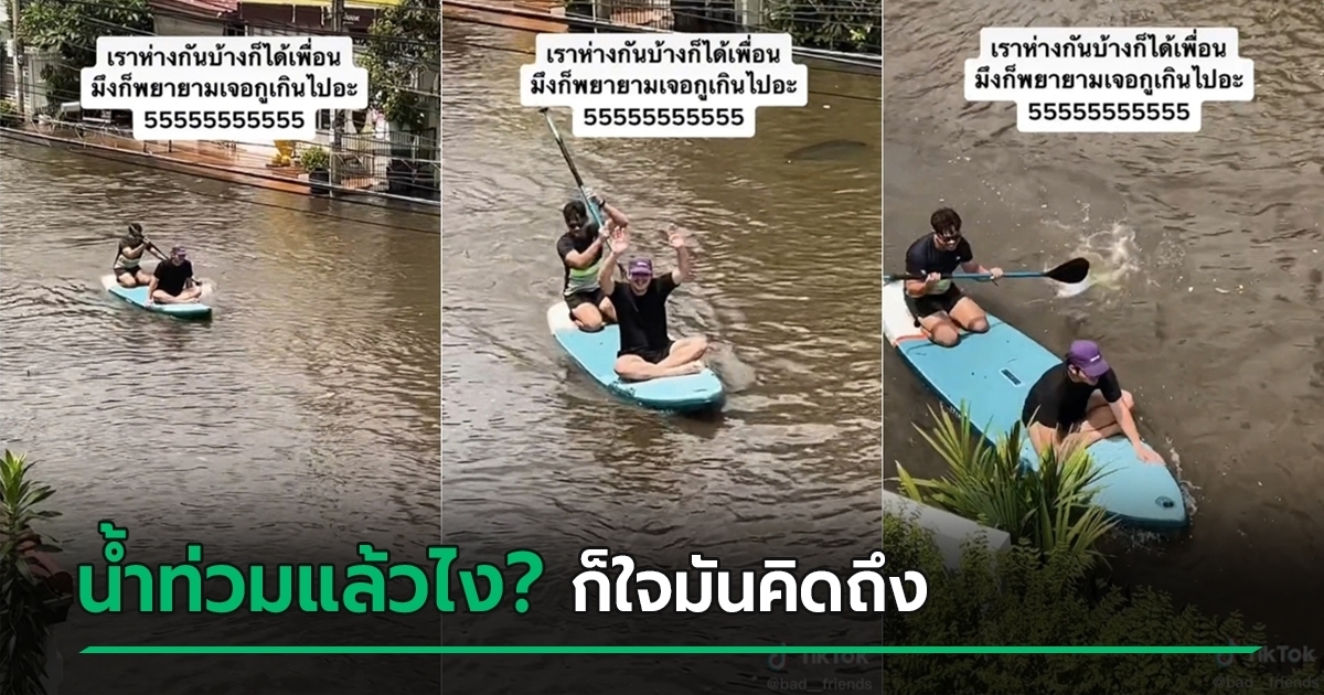 เมื่อวานนี้ (12 กันยายน 2565) ช่อง TikTok@bad__friends ได้มีการโพสต์คลิปวิดีโอที่กำลังเป็นไวรัลในตอนนี้ ซึ่งมีผู้เข้าชมแล้วร่วม 3 ล้านวิวภายใน 1 วัน หลังจากมีการเผยคลิปสภาพในซอยหน้าบ้านย่านเมืองทองธานี ที่เต็มไปด้วยน้ำท่วมขัง แต่ก็ไม่อาจขวางกั้นมิตรภาพระหว่างเพื่อน ๆ ได้ เพราะหนุ่มเจ้าของคลิปเผยให้เห็นวินาทีที่เพื่อนของเขา 2 คน มีความพยายามพายซัพบอร์ด (SUP Board) มาหา โดยไม่สนใจว่าจะต้องลุยน้ำท่วม