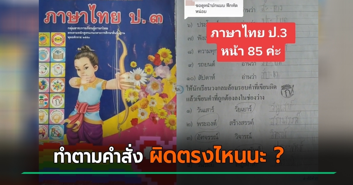 โดยจากคลิป TikTok@jeab_songya คุณแม่เผยให้เห็นหน้าตาโจทย์วิชาภาษาไทยของนักเรียนชั้น ป.3 ของลูกสาว หลังครูสั่งการบ้านมาให้ทำ ซึ่งหากมองผ่าน ๆ ก็จะพบว่าลูกทำตามโจทย์สั่งเป๊ะ ๆ แต่โชคดีที่แม่เอามาตรวจทานดูก่อน ไม่อย่างนั้นลูกคงไม่ได้สักคะแนนเดียว
