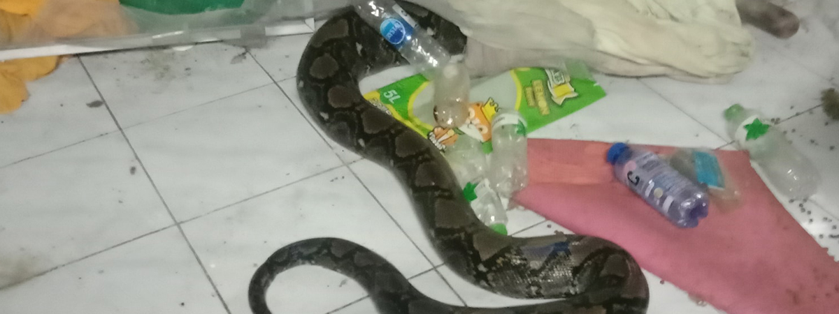ทำเจ้าของบ้านช็อก หลังพบงูเหลือมยาว 5 เมตร เลื้อยเข้าบ้านหนีน้ำท่วม ก่อนเร่งจับออกจากพื้นที่