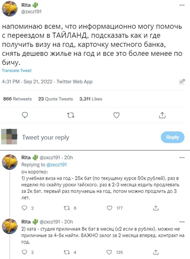 ในโซเชียลมีเดีย มีชาวรัสเซียผู้ใช้บัญชีทวิตเตอร์ @zxcz191 ให้ข้อมูลเกี่ยวกับการย้ายถิ่นฐานมายัง "ประเทศไทย" ชี้เป้าบอกพิกัด ทั้งเรื่องการทำวีซ่าระยะยาว ค่าใช้จ่าย การเช่าที่อยู่อาศัยราคาถูก ซึ่งได้รับความสนใจอย่างรวดเร็ว ยกตัวอย่างข้อมูลที่เจ้าของโพสต์รายนี้ระบุ เช่น