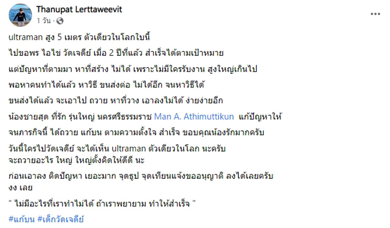 ไฮโซปอ ตนุภัทร สร้างรูปปั้นอุลตร้าแมน สูง 5 เมตร ตัวเดียวในโลก มาแก้บนไอ้ไข่ วัดเจดีย์ เผยก่อนเอาลงติดปัญหาเยอะมาก พอจุดธูปจุดเทียนแจ้งขออนุญาตก็ลงได้เลย
