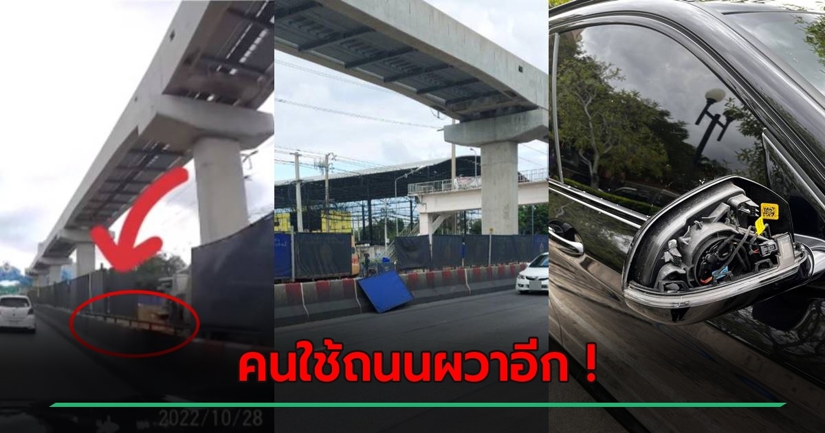 เจ้าของรถเตือนภัย ขับผ่านถนนแจ้งวัฒนะ เส้นก่อสร้างรถไฟฟ้าสายสีชมพู จู่ ๆ ได้ยินเสียงดังปัง กระจกข้างแตกกระจาย เช็กกล้องหน้ารถพบรถชนแผ่นกันฝุ่นของไซต์งาน หลังร่วงตั้งฉากยื่นหาถนน ตอนขับผ่านแทบดูไม่ออก
