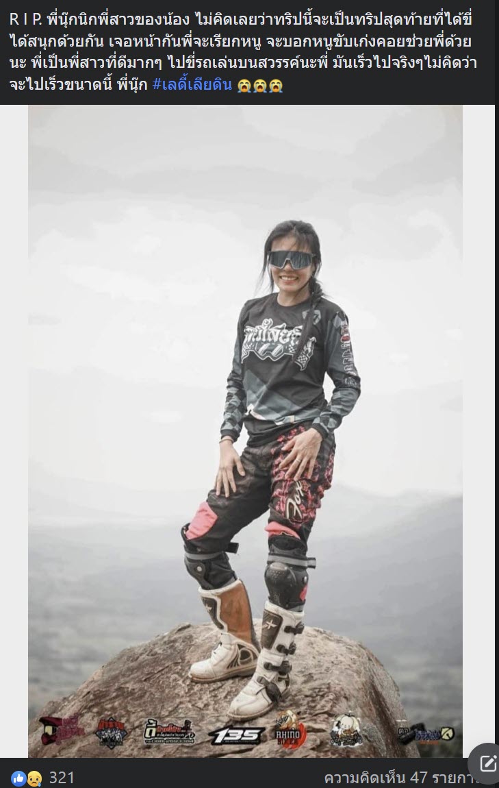 ขณะเดียวกันในโลกโซเชียล มีเพื่อนฝูงแล้วคนรู้จักของ นุ๊กนิ้ก ต่างแสดงความอาลัยกับการจากไปของเธอเป็นจำนวนมาก โดยโปรไฟล์พบว่า นุ๊กนิ้ก เป็นนักแข่งรถจักรยานยนต์ทางเรียบ ที่ชื่นชอบการขับขี่แข่งรถเป็นชีวิตจิตใจ และมักจะมีภาพการขับขี่รถบิ๊กไบค์ประลองความเร็วตามสนามแข่งขันหลายแห่งด้วย