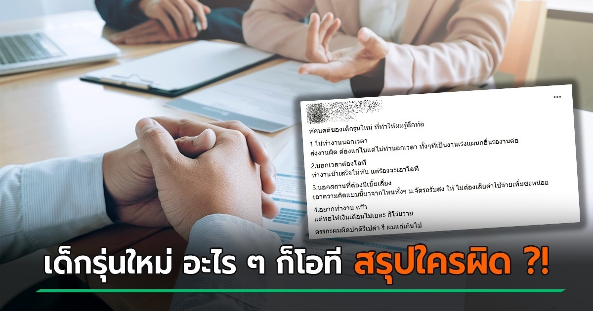 กลายเป็นประเด็นถกเถียงในกลุ่มฝ่ายบุคคล (HR : Human Resources) ขึ้นมาทันที หลังจากมีผู้ใช้เฟซบุ๊กรายหนึ่งโพสต์ ระบายลงกลุ่มว่ารู้สึกท้อกับทัศนคติของเด็กรุ่นใหม่เกี่ยวกับการทำงาน โดยแบ่งออกได้เป็น 3 ข้อ คือ