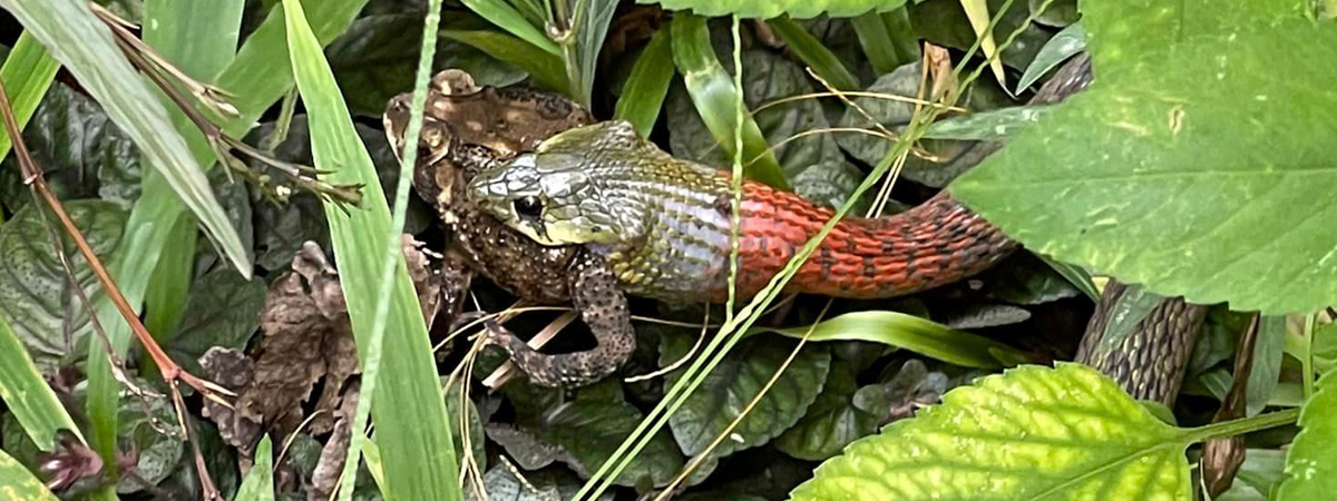 เฟซบุ๊ก Kornkaew Nokkaew ได้โพสต์ในกลุ่ม siamensis.org ซึ่งเป็นภาพตอนพบงูกำลังเขมือบคางคกในป่า โดยพยายามเขมือบเข้าไปทั้งตัว อีกทั้งงูตัวนี้มีคอสีแดง จึงทวีเพิ่มความสงสัยว่า มันคืองูพันธุ์อะไร ก่อนที่ชาวเน็ตจะมาช่วยไขข้อสงสัยให้เธอ งูตัวนี้เป็นงูลายสาบคอแดง มีพิษอันตรายแต่ไม่ดุร้าย ยิ่งคอแดงพิษยิ่งแรงขึ้น และคางคกคือของโปรดของงูชนิดนี้เลยก็ว่าได้
