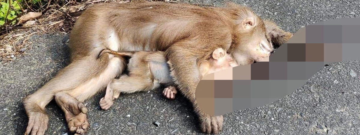 ลิงแสมสองแม่ลูก ถูกรถชนกลางถนนเกาะช้าง จุดเกิดเหตุเป็นจุดที่นักท่องเที่ยวลอบให้อาหารลิง
