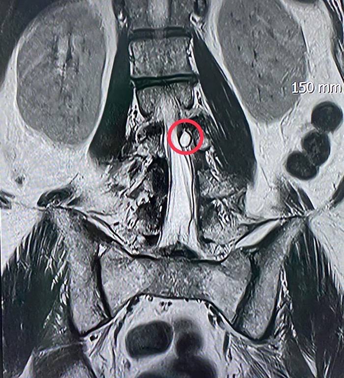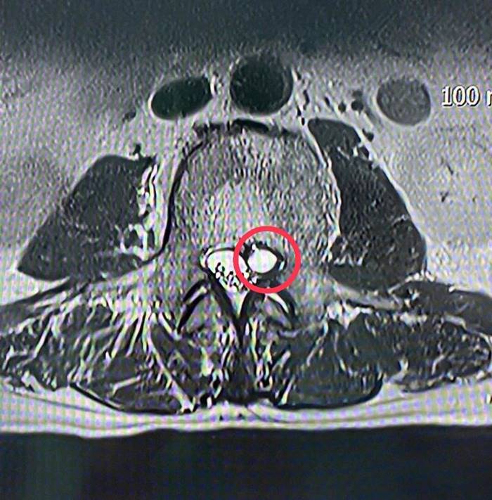 ผลการตรวจสอบจากผู้เชี่ยวชาญด้านศัลยศาสตร์ระบบประสาท คาดว่า เส้นประสาทถูกกดทับ ระดับกระดูกสันหลังข้อที่ 4 จึงส่งตรวจวินิจฉัยโรคเพิ่มเติมด้วย MRI ทำให้เห็นว่ามีก้อนเนื้อไปกดเบียดทับเส้นประสาทอย่างชัดเจน