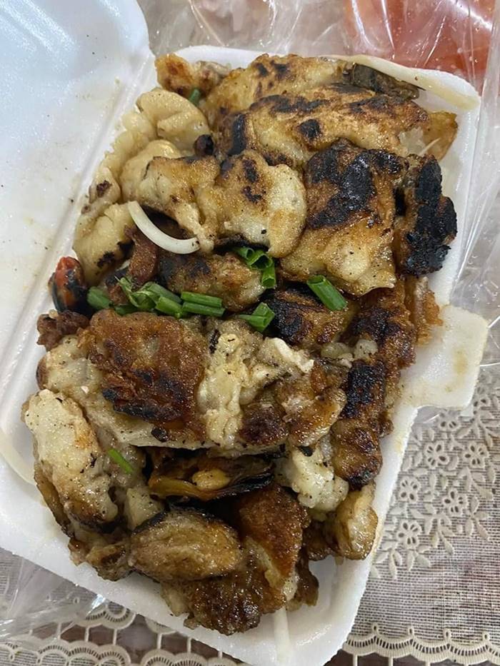 เป็นภาพหอยทอดในกล่องที่มีลักษณะบางส่วนไหม้เกรียมจนเป็นสีดำ
