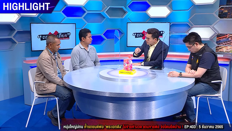 ขณะเดียวกัน ทางไฟแนนซ์ได้ไปสืบทรัพย์มาแล้ว ปรากฏว่า พ่อพระเอกคนนี้ เขาไม่มีทรัพย์สินอะไรเลย ขณะที่ตัวลูกชายคนโตตนได้พยายามโทร. ติดต่ออยู่ตลอด แต่เขาก็ไม่ได้ช่วยอะไรเลยสักอย่าง สุดท้ายตนต้องเอารถของตัวเองไปเข้าลีสซิ่ง ได้เงินมา 3.2 แสนบาท ส่วนที่เหลือได้ไปขอให้พ่อพระเอกช่วยอีกครั้ง ซึ่งเขาก็ใช้เวลาแค่ 20 นาที เอาเงินมาให้ตน 1 แสนบาท ตนก็งงว่าเขาเอาเงินมาจากไหน ทั้งที่ตลอดเวลาไม่เคยไปผ่อนรถเลย