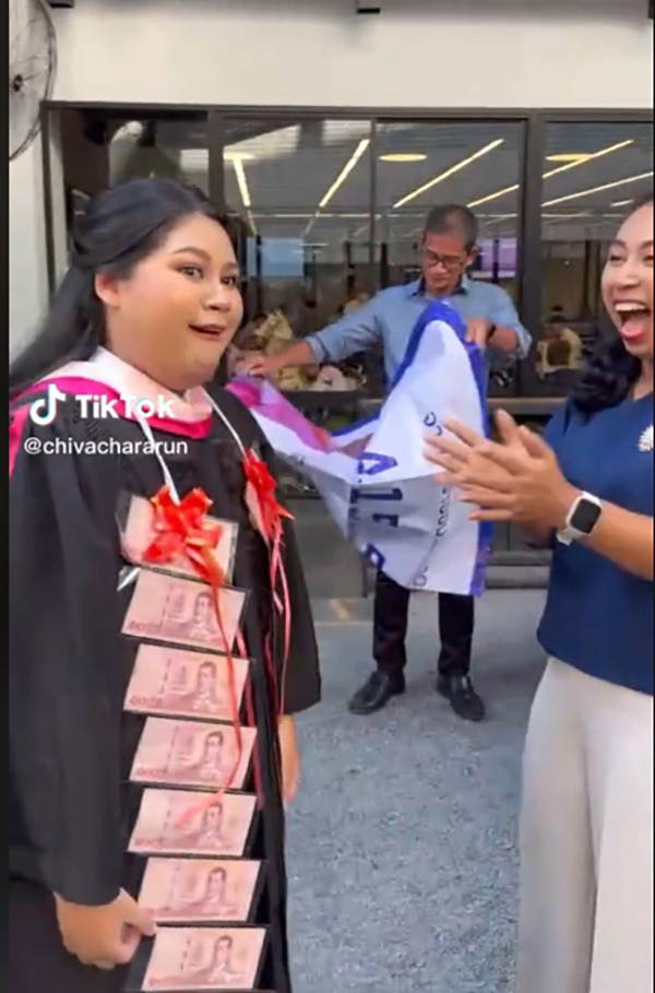 เรียกว่าเป็นวันที่คนเป็นพ่อเป็นแม่รอคอยเลยก็ว่าได้ สำหรับวันรับปริญญา เพราะเป็นวันที่ลูกประสบความสำเร็จเติบโตขึ้นอีกระดับหนึ่งแล้ว และมักจะหาของขวัญมามอบให้ โดยล่าสุด (12 ธันวาคม 2565) ผู้ใช้แอปฯ TikTok @chivachararun ได้มีการเผยคลิปพ่อแม่เอาป้ายไวนิลขนาดใหญ่มามอบให้ลูก