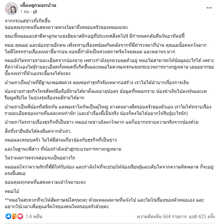 ทั้งนี้ ตนยืนยันว่า ครอบครัวไม่มีส่วนเกี่ยวข้องกับธุรกิจที่เป็นข่าว และในฐานะพี่สาว ไม่ว่าผลการตรวจสอบจะเป็นอย่างไร ตนแน่ใจว่าความรักที่พี่มีให้น้อง และกำลังใจที่จะช่วยให้น้องเรียนรู้ เติบโตจากความผิดพลาดจะอยู่ตรงนี้เสมอ
