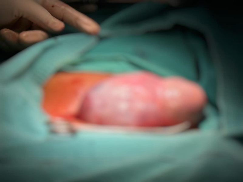 ผลการผ่าตัด พบก้อนเนื้อรังไข่ขนาด 18 เซนติเมตร 1 ข้าง เริ่มมีขั้วบิดพันกัน 1 รอบ แต่ก้อนเนื้อยังไม่มีภาวะขาดเลือดมาเลี้ยง จึงได้ตัดก้อนเนื้อออก ส่วนรังไข่อีกข้างพบเป็นเนื้องอกไม่ใหญ่มาก จึงตัดออกไปด้วย เหลือเพียงเนื้อเยื่อรังไข่ไว้บางส่วนเพื่อให้ผลิตฮอร์โมนได้