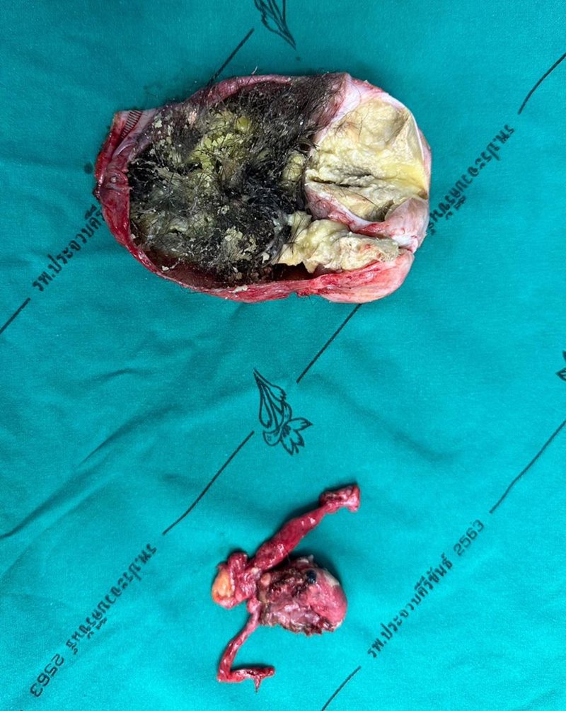 ส่วนก้อนเนื้อที่ผ่าตัดออกมา ก็พบเส้นผม ชิ้นส่วนเล็บ หนังศีรษะ กระดูก ไขมันอยู่เต็มก้อน ส่วนสาเหตุที่เกิดการท้องผูก เพราะก้อนเนื้อในอุ้งเชิงกรานมีขนาดใหญ่ ทำให้ไปกดทับลำไส้ใหญ่ กดทับกระเพาะปัสสาวะ ทำให้ปัสสาวะบ่อย ดังนั้น หากมีอาการผิดปกติอย่างนี้ไม่ควรละเลย เพราะเสี่ยงต่อภาวะแทรกซ้อนได้ เช่น ถุงน้ำบิดขั้วจนขาดเลือดไปเลี้ยง ส่งผลให้รังไข่เน่า ถุงน้ำแตก รั่ว ติดเชื้อรุนแรงตามมา อันตรายมากขึ้น และมีโอกาสพัฒนาเป็นมะเร็งมีน้อยเพียง 1%