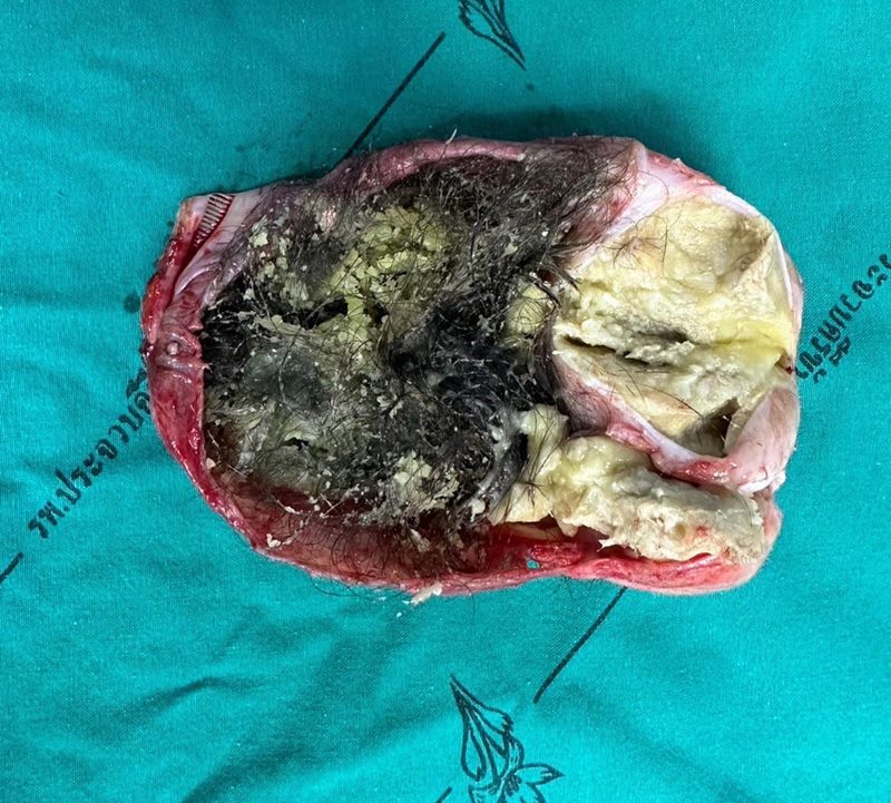 ก้อนเนื้อขนาดใหญ่ มีเส้นผมอยู่ข้างใน