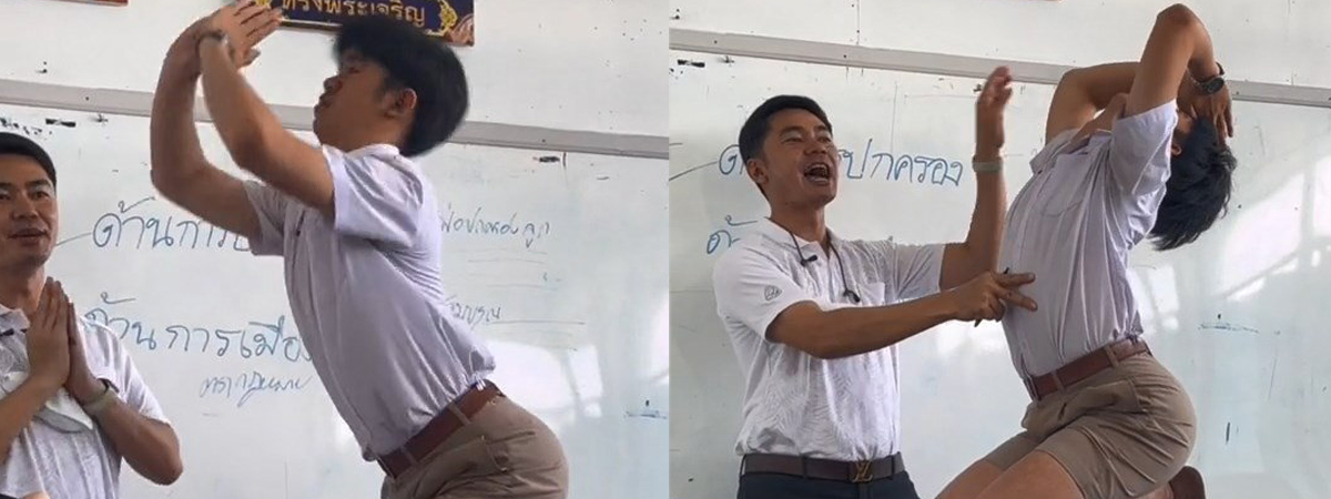 ผู้ใช้ TikTok @tubpadd ได้เผยภาพตอนสอนวิชาการปกครอง กับการกราบไหว้แบบถูกวิธี พร้อมทั้งให้นักเรียนออกมาสาธิตให้ดูหน้าชั้นเรียน แต่ดันเจอนักเรียนสู้กลับ กราบไหว้แบบเล่นใหญ่ จนครูเห็นถึงกับไปไม่เป็น เรียกเสียงฮาสนั่นห้องเรียน จนทำให้ภาพดังกล่าวเป็นที่พูดถึงอย่างล้นหลามบนโลกออนไลน์