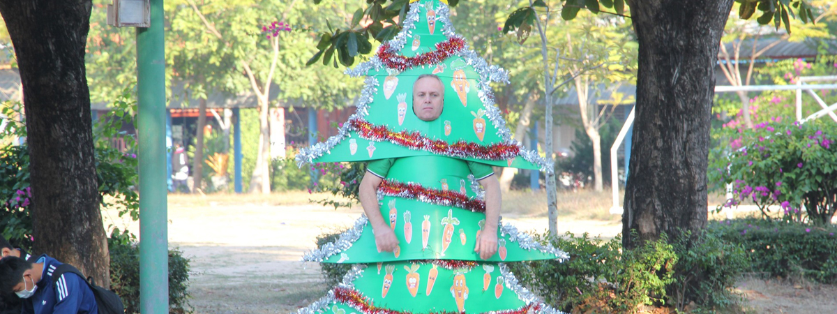 สีสันวันคริสต์มาส ครูต่างประเทศเล่นใหญ่ แต่งคอสเพลย์เป็นต้นคริสต์มาส เด็กมองกันทั้งโรงเรียน