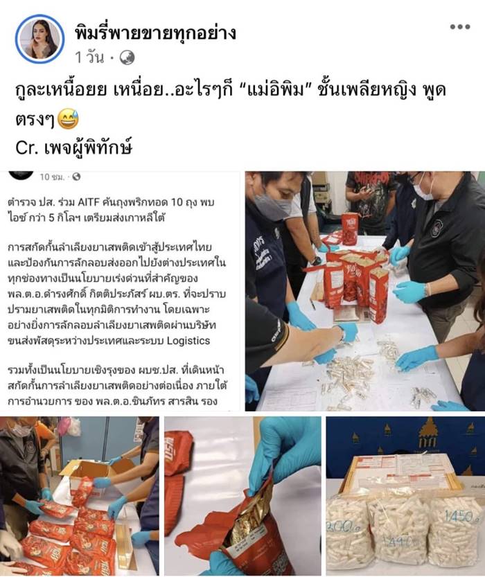 มีการส่งยาเสพติดไปที่เกาหลีใต้ โดยใส่เข้าไปในซองพริกทอดของพิมรี่พาย