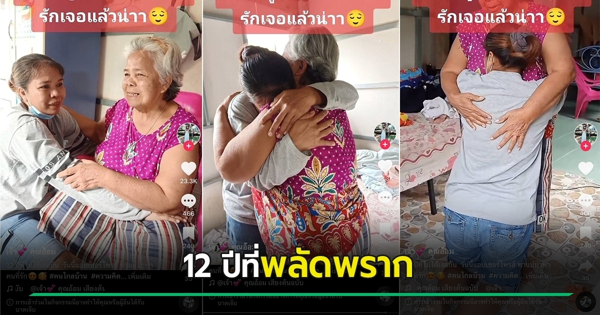 โดยเจ้าของคลิปเผยว่า 12 ปีที่หายไป วันนี้หนูตามหาคนที่แม่รักเจอแล้วนะ ซึ่งในคลิปนั้นลูกสาวได้พาแม่นั่งรถ พอถามแม่ว่าจะไปไหนเนี่ย แม่ก็บอกว่าไม่รู้ ก่อนจะจอดรถที่บ้านหลังหนึ่งแล้วพบเจอญาติ แม่ถึงกับตกใจก่อนจะยิ้มออกมาด้วยความดีใจ จากนั้นรีบเข้าไปหายาย กอดและก้มลงไปกราบเท้า ทำเอาหลายคนถึงกับกลั้นน้ำตาไม่อยู่