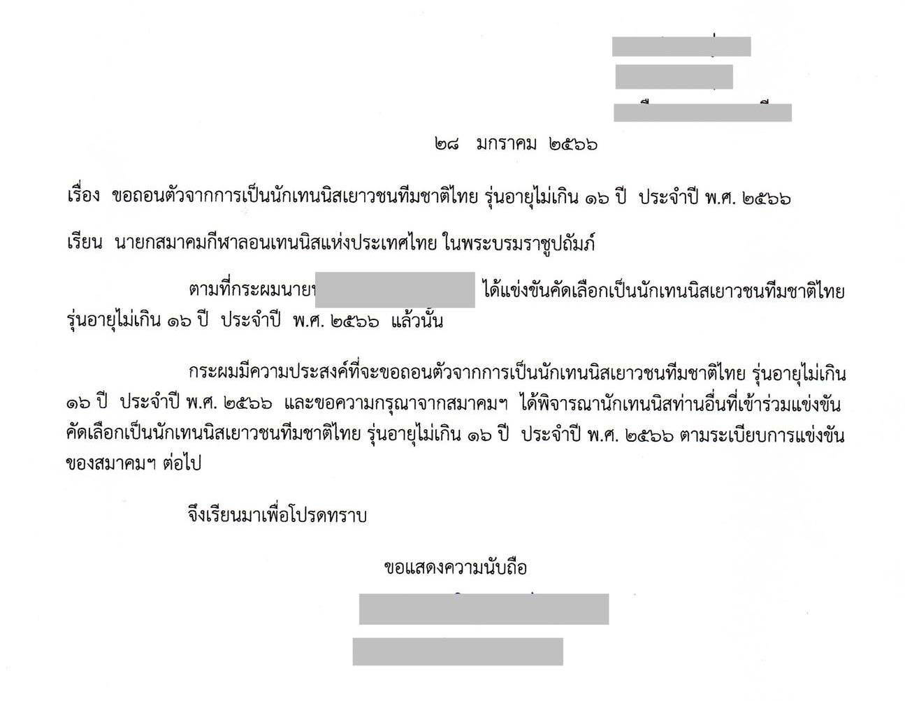 ได้ส่งหนังสือขอถอนตัวออกจากการเป็นนักกีฬาเทนนิสเยาวชนทีมชาติไทย ประจำปี