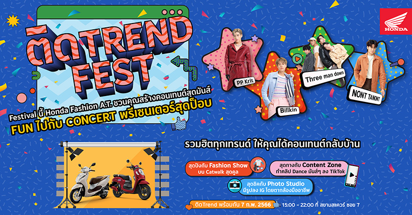 กลับมาอีกครั้งกับ Festival สุดชิคเกร๋ จาก Honda Fashion A.T. ผู้นำอันดับ 1 ของรถมอเตอร์ไซค์ ปีนี้มาใน concept ‘ติด Trend Fest’ รวมทุกเทรนด์ฮิตบนโซเชียล มาอยู่ในเฟสติวัลเดียว ให้คุณได้ทำคอนเทนต์สุดมันส์ จนโลกโซเชียลต้องลุกเป็นไฟ