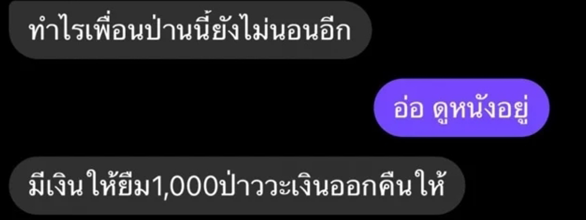 เฟซบุ๊กจากกลุ่ม กลุ่มที่ไม่ว่าพิมพ์อะไรเราก็ให้กำลังใจในทุกเรื่องแบบงงๆอิหยังวะ ได้เผยภาพแชตของหญิงสาวรายหนึ่ง หลังจากที่เพื่อนทักมาถามว่าทำอะไรอยู่ ก่อนที่ยิงคำถามที่ว่าขอยืมเงิน 1,000 บาท ถ้าเงินออกเดี๋ยวคืนให้ ก่อนที่สาวท่านนี้ตอบกลับไปแบบจุก ๆ ถึงกับตัดบทเพื่อนทันที งานนี้ใครที่ประสบชะตาเดียวกัน คงได้ใจไปเต็ม ๆ