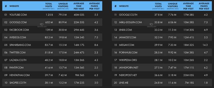 โดยที่เว็บไซต์ 3 อันดับแรกที่คนไทยเข้ามากที่สุดคือ Youtube.com, Google.com, Facebook.com ทว่าอันดับที่ 4-5 นั้น กลับเป็นเว็บไซต์ 18+ ชื่อดัง 2 เว็บไซต์ ที่คนเข้าไปดูถึงกว่าเดือนละ 80 ล้านครั้ง