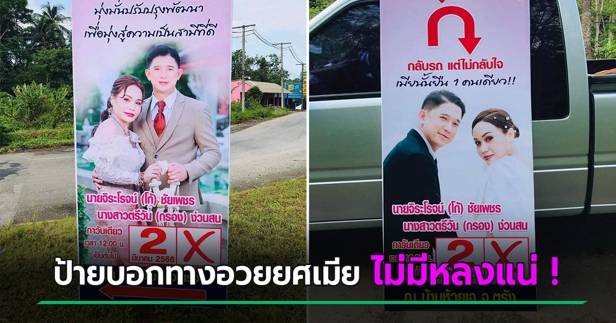 บ่าวสาวอารมณ์ดี ทำป้ายบอกทางแต่งงาน เหมือนป้ายหาเสียง ตั้งชื่อ