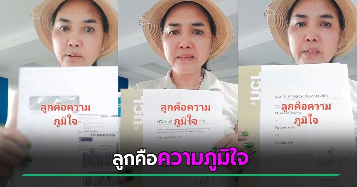 เช่นเดียวกับคุณแม่ท่านนี้ ที่ลูกเป็นนักศึกษาทุนปริญญาโท และได้คว้าเกียรตินิยมอันดับ 1 จากมหาวิทยาลัยลอนดอน ทำให้คุณแม่ดีใจจนน้ำตาไหล ก่อนมีการโพสต์คลิปลง TikTok@pakasing เมื่อได้รับเอกสารเป็นใบปริญญาของลูกจากอังกฤษส่งมาที่บ้าน