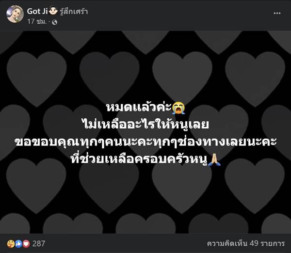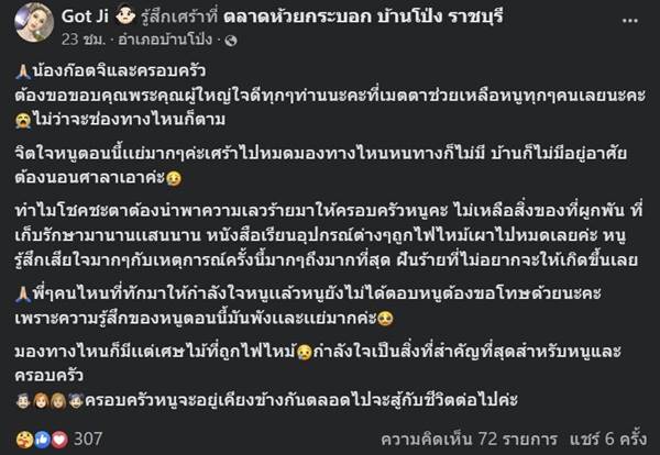นอกจากนี้ น้องก็อตจิ ได้ลงคลิปเหตุการณ์ขณะเพลิงไหม้บ้านทั้งหลังจนวอด มีคนเข้ามาดูกันเป็นจำนวนมาก และพ่อก็ถามก็อตจิด้วยประโยคสั้น ๆ ที่บาดลึกลงในใจว่า "คืนนี้เราจะไปนอนที่ไหนลูก เราไม่เหลืออะไรแล้ว แค่ประโยคเดียวหนูก็ทรมานมาก ๆ ที่สุดในชีวิต ครอบครัวหนูต้องขอขอบพระคุณทุกคนมาก ๆ นะคะที่ช่วยเหลือในทุก ๆ ช่องทางเลยนะคะ หนูจะสู้และเดินหน้าต่อไปค่ะ หนูจะไม่ท้อค่ะ ถึงจิตใจหนูจะแย่มาก ๆ ก็ตามค่ะ ได้กำลังใจจากพี่ ๆ ทุกคนหนูก็น้ำตาจะไหลค่ะ ร้องไห้จนไม่มีน้ำตาทรมานที่สุดค่ะ"