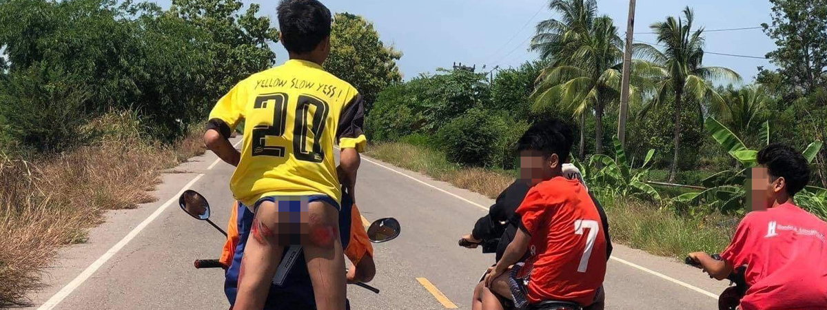เฟซบุ๊ก Somporn Chawpra ได้โพสต์ในกลุ่ม กลุ่มที่เราจะแกล้งกวนตีนกันทุกเรื่องทุกเวลา V.2 ซึ่งเป็นภาพของแก๊งเด็กแว้น รวมตัวกันซิ่งมอเตอร์ไซค์ แต่มีหนุ่มคนหนึ่งขับพลาดจนรถล้ม แผลถลอกเต็มขาและก้น เลยทำให้เขาต้องถอดกางเกง เหลือเพียงแต่กางเกงในอย่างเดียว เจ็บแผลจนไม่สามารถนั่งซ้อนท้ายรถเพื่อนได้ จึงยืนซ้อนมอเตอร์ไซค์กลับบ้านแทน อีกทั้งภาพดังกล่าวยังเป็นไวรัลดัง มีคนไลก์และแชร์เป็นจำนวนมาก