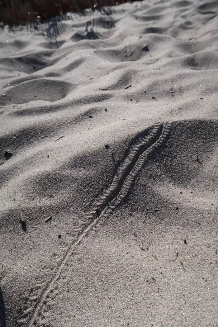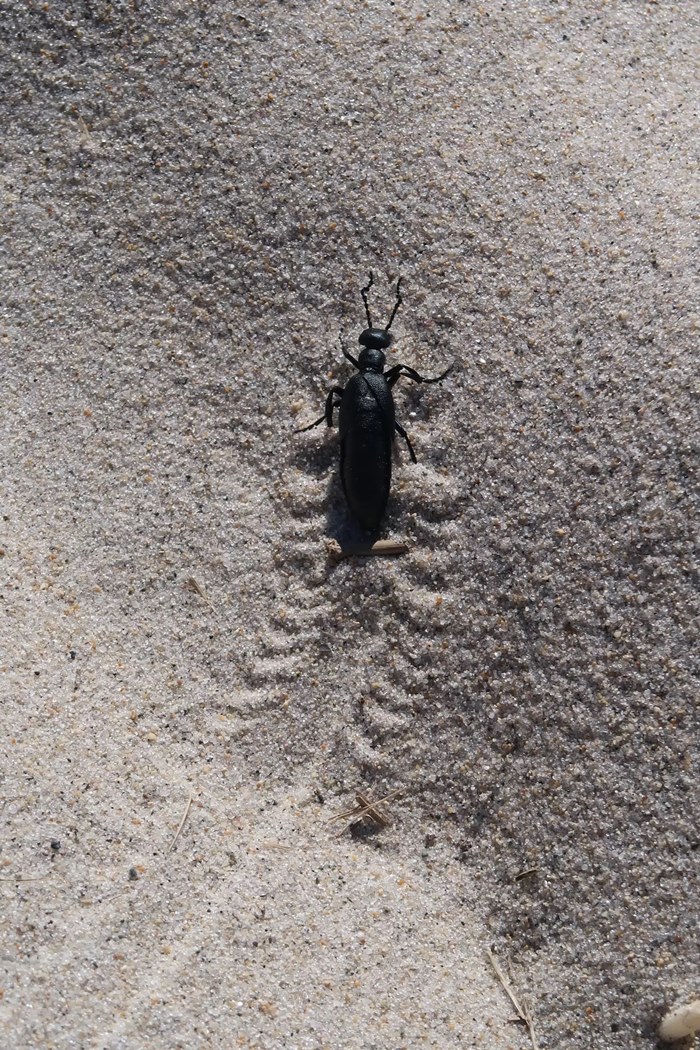 มันคือ เจ้าแมลงปีกแข็งสีดำตัวหนึ่ง ที่กำลังเดินเพลิดเพลินอยู่บนพื้นทราย หารู้ไม่ว่าร่องรอยที่มันทำทิ้งไว้เป็นทางยาว ได้สร้างความสับสนให้กับสองแม่ลูกได้เช่นนี้