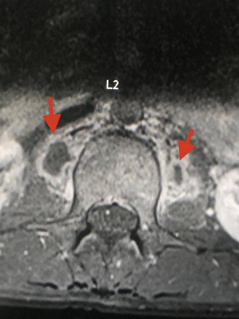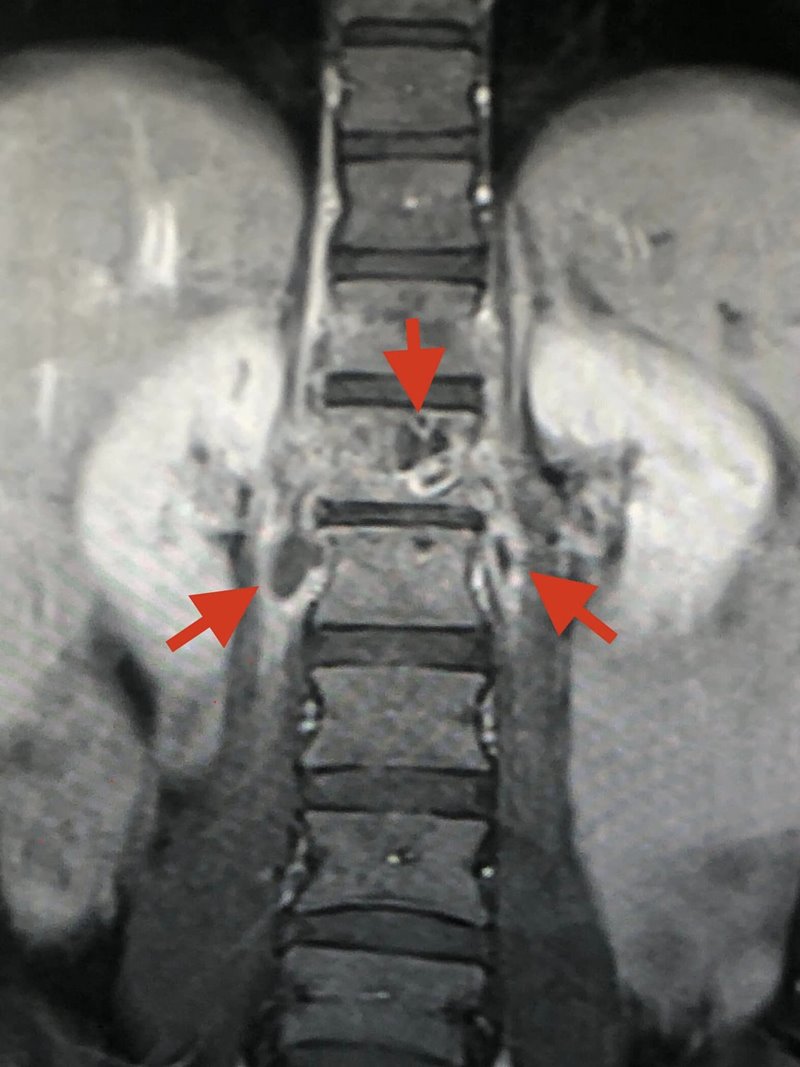 อย่างไรก็ตาม เมื่อลองทำ MRI กระดูกสันหลังส่วนเอว กลับพบความผิดปกติ และมีความเป็นไปได้ที่เธอจะเป็นวัณโรคของกระดูกสันหลังส่วนเอวชิ้นที่ 1 และสงสัยว่าจะมีการอักเสบรอบ ๆ เนื้อเยื่อกระดูกสันหลังส่วนเอวชิ้นที่ 1 และ 2 ร่วมด้วย จึงทำการเจาะเนื้อเยื่อรอบกระดูกสันหลัง ส่งตรวจย้อมเพื่อหาเชื้อวัณโรค และให้ผลลบ จากนั้นก็รอเพาะเชื้อวัณโรค ส่งตรวจพยาธิวิทยา พบว่าเนื้อเยื่อตายและไม่พบมะเร็ง และสรุปได้ว่า เธอเป็นวัณโรคที่กระดูกสันหลัง