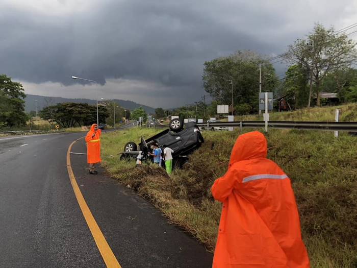 ฝนตกถนนลื่น เก๋งเสียหลักทางโค้งพุ่งชนเสาไฟฟ้า พระสงฆ์ดัง 2