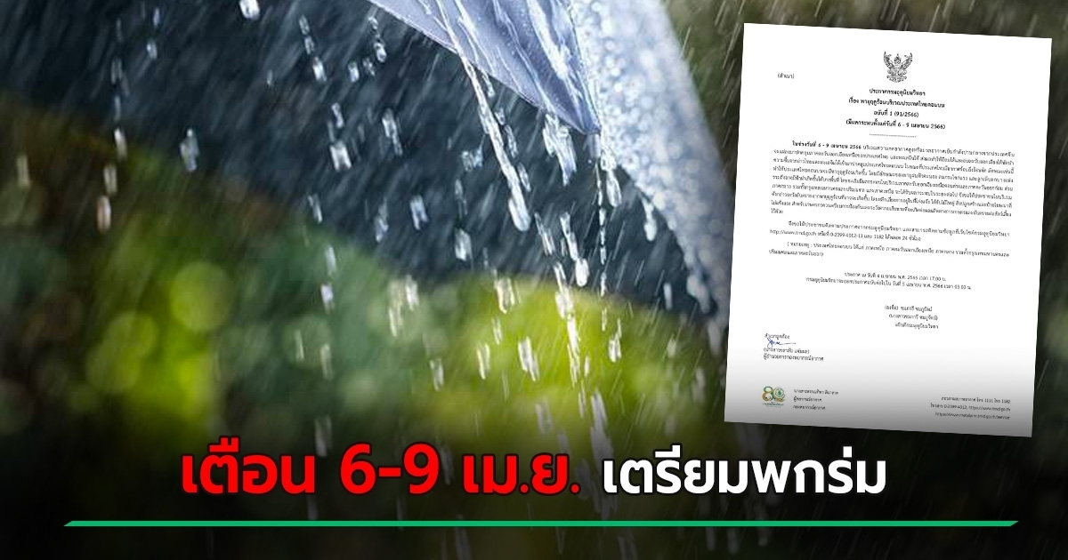 กรมอุตุนิยมวิทยา ออกประกาศเตือนพายุฤดูร้อนบริเวณประเทศไทยตอนบน 6-9 เมษายน 2566 ระวังฝนตกหนัก ลมกระโชกแรง ลูกเห็บตก และฟ้าผ่า