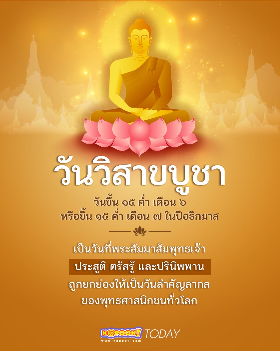 3. วันวิสาขบูชา เป็นวันที่พระพุทธเจ้าเสด็จเข้าสู่ปรินิพพาน (ดับสังขารไม่กลับมาเกิดสร้างชาติ สร้างภพอีกต่อไป)