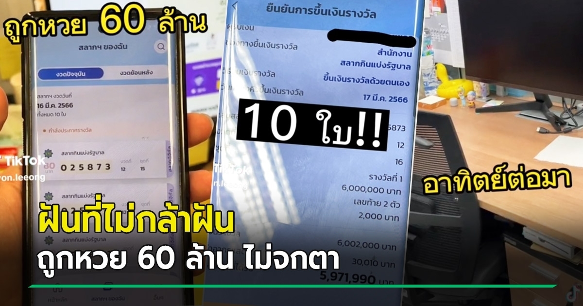 สาวออฟฟิศ ถูกรางวัลที่ 1 จำนวน 10 ใบมูลค่า 60 ล้าน งวดวันที่ 16 มีนาคม 2566 ผ่านไป 1 สัปดาห์ โต๊ะว่างเนียนกริบ จนเจ้าตัวต้องมาแจง ฝันที่ไม่กล้าฝัน แต่จะทำเหมือนกันถ้าถูกหวยแบบนี้จริง ๆ