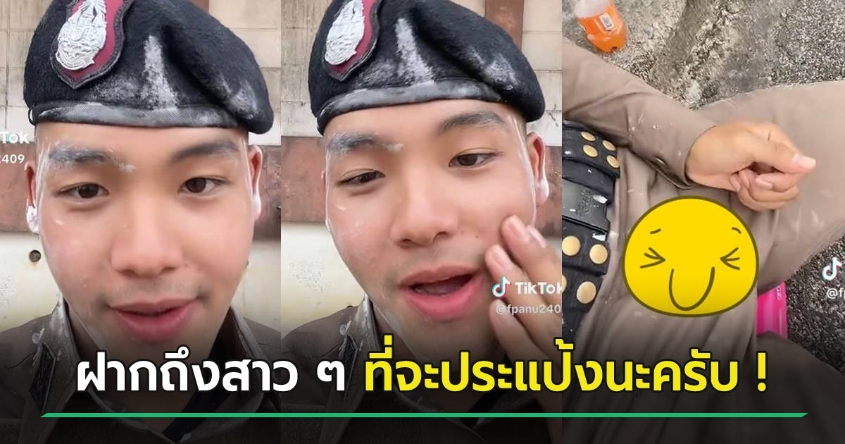 อย่างเช่นตำรวจหนุ่มหน้ามนรายนี้ ที่ล่าสุด (14 เมษายน 2566) โดนสาว ๆ ประแป้ง ตั้งแต่ใบหน้าลามลงมาถึงเป้าเลยทีเดียว จนเจ้าตัวต้องลงคลิปใน TikTok @fpanu2409 ฝากไปถึงสาว ๆ ที่เล่นสงกรานต์ ระบุว่า...