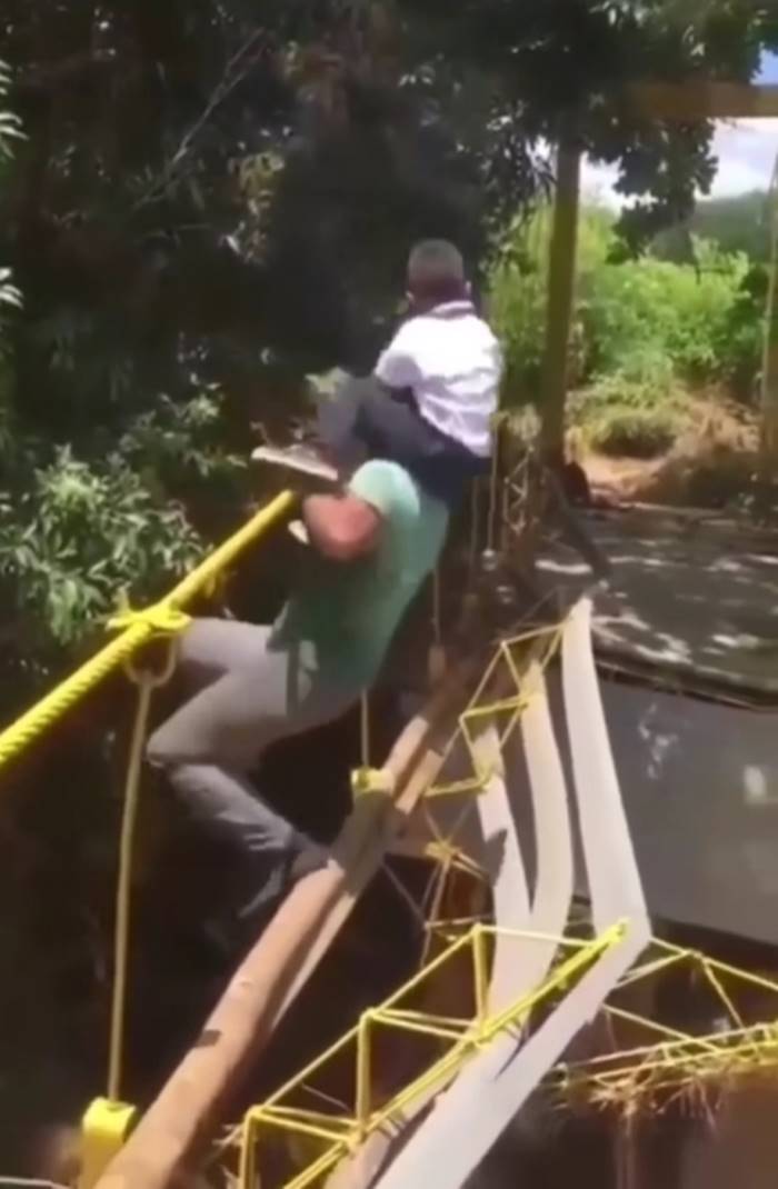 แม่พยายามเดินทรงตัวไปบนท่อนไม้เล็ก ๆ ที่ถูกนำมาพาดเอาไว้บนสะพานเชือก แต่ภายหลังจากออกตัวไปได้ไม่กี่ก้าว ไม่กี่วินาทีหลังจากนั้น เหตุการณ์สุดช็อกก็เกิดขึ้น เมื่อท่อนไม้กลิ้งพลิกทำให้แม่เด็กลื่นจนเสียการทรงตัว เด็กชายที่อยู่บนบ่าจึงกระเด็นร่วงตกลงไปยังแม่น้ำด้านล่าง ส่วนแม่เด็กคว้าเชือกราวสะพานจับเอาไว้ได้ทัน ก่อนที่คลิปวิดีโอจะตัดไป พร้อมกับเสียงกรีดร้องของผู้ที่อยู่ในเหตุการณ์
