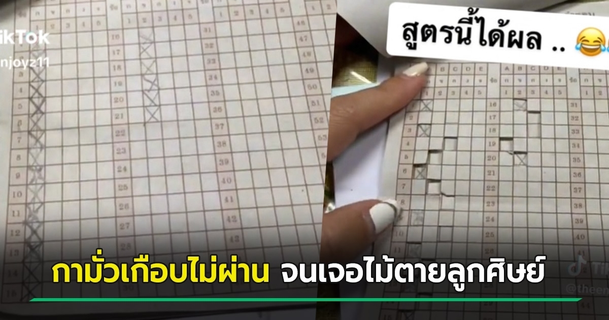 วันที่ 22 เมษายน 2566 TikTok @theenjoyz11 ครูรายหนึ่งมีการลงข้อสอบปลายภาคของนักเรียนรายหนึ่งโชว์ ซึ่งก่อนตรวจเห็นชัด ๆ ว่า นักเรียนคนนี้ดิ่งตอบ ก. ตั้งแต่ข้อ 1-15 และตอบ ข. ในข้อ 16-21 คราวนี้มาดูกันว่า จะได้กี่คะแนน