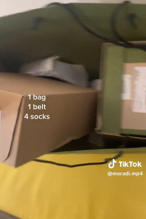 ภายในถุงเหล่านั้นมีผลิตภัณฑ์ของทางแบรนด์หลายชิ้นด้วยกัน เช่น ถุงเท้า 4 คู่ กระเป๋า 1 ใบ เข็มขัด รวมถึงกางเกงและเสื้อคลุมอีกหลายตัว ซึ่งล้วนแล้วแต่เป็นของที่พนักงานต้องนำมาใช้ระหว่างการทำงาน อย่างไรก็ตาม สาวรายนี้เขียนแคปชั่นขำ ๆ ไว้ด้วยว่า "ฉันควรจะเก็บถุงเอาไว้แล้วล่องหนไปดีไหม"