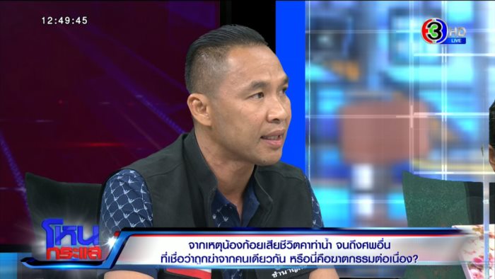 ธันย์นิชา : ขอพูดบ้าง วันนี้เข้าใจว่าแยกธาตุเสร็จแล้ว คณะทำงานของเรา ผู้ที่คาดว่าเป็นผู้เสียหาย เราก็มีคณะทำงาน เก็บข้อมูลล่วงหน้ามาก่อนหน้านี้เราทำงานเหมือนตำรวจนะ เพราะน้องเขากังวลมาก เขาก็พูดหลาย ๆ อย่าง เราออกภาคสนามเก็บข้อมูลหมดแล้ว ตอนนี้แอมโทร. อีกแล้ว โทร. มาตลอด (หัวเราะ) ตอนแรกเข้าใจว่ามีการตรวจชันสูตรพลิกศพแยกธาตุเรียบร้อยแล้ว เพราะคณะทำงานของเราส่วนหนึ่ง มีความรู้เรื่องชันสูตรพลิกศพ การที่ให้ข่าวออกไปไม่ว่าอะไร แต่ต้องบอกว่าเป็นการตรวจสอบกรณีตายผิดธรรมชาติ ต้องมีการชันสูตรพลิกศพ ถ้าตายโดยธรรมชาติ จะมีหัวข้อลึก ๆ ลงไป
