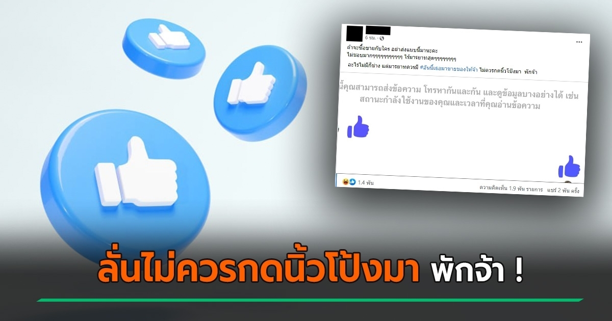 วันที่ 4 พฤษภาคม 2566 ผู้ใช้เฟซบุ๊กรายหนึ่ง ได้แคปแชตการพูดคุย ซึ่งอีกฝ่ายได้มีการกดปุ่มนิ้วโป้งมาให้ในช่องแชต พร้อมข้อความแบบเกรี้ยวกราดว่า "ถ้าจะซื้อขายกับใคร อย่าส่งแบบนี้มานะคะ ไม่ชอบมาก ๆ ๆ ๆ ๆ ๆ ๆ ๆๆ ๆ ๆ ๆ ไร้มารยาทสุด ๆ ๆ ๆ ๆๆ ๆ ๆ ๆ อะไรไม่มีก็ช่าง แต่มารยาทควรมี #อันนี้เธอมาขายของให้จ้า ไม่ควรกดนิ้วโป้งมา พักจ้า"